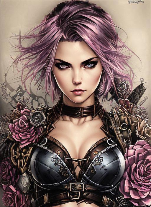 style of joemadureira (nvinkpunk:1.3) (snthwve style:1.4) Charlie Bowater realistic Lithography sketch portrait of a woman, flowers, [gears], pipes, dieselpunk, multi-colored ribbons, old paper texture, highly detailed