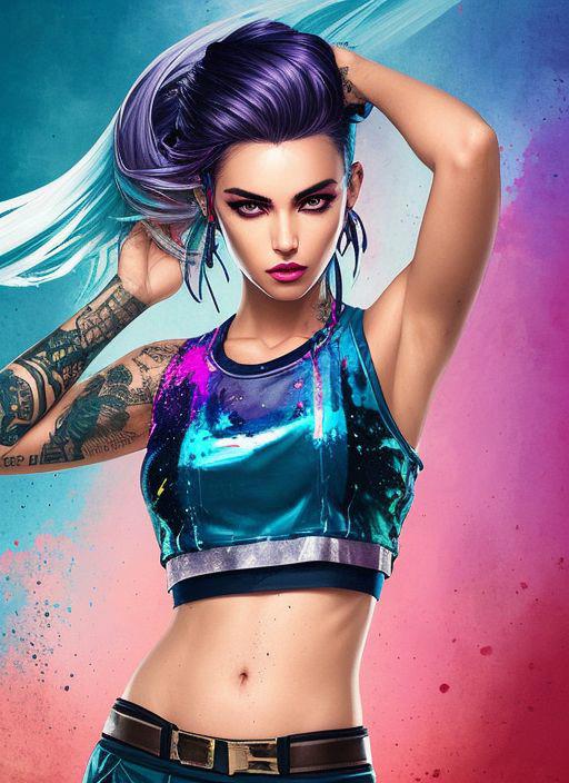 style of joemadureira (nvinkpunk:1.3) (snthwve style:1.4) award winning half body portrait of a woman in a croptop and cargo pants with ombre navy blue teal hairstyle with head in motion and hair flying, paint splashes, splatter, outrun, vaporware, shaded flat illustration, digital art, trending on artstation, highly detailed, fine detail, intricate