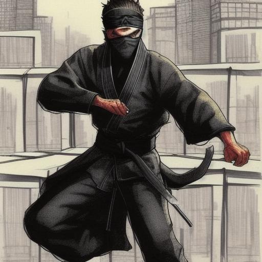 ninja on a dojo roof running and throwing shurikkens , PEN-INK-PORTRAITS-BENNORTHEN