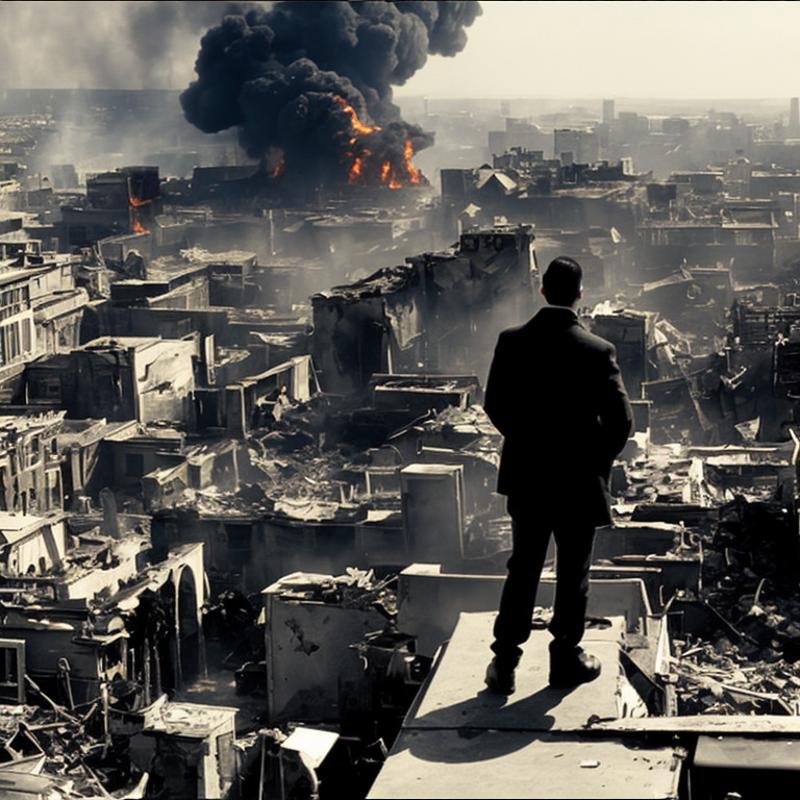 SinCityMovie Style landscape of a post apocalyptic city, smoking buildings, fire, debris, chaos