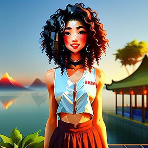full body portrait of a nimble, trim, Anxious speaker woman, Informative, drunk, with long curly brown hair wearing nontraditional miko , digital art, trending on artstation, highly detailed, fine detail, intricate, outrun, vaporware