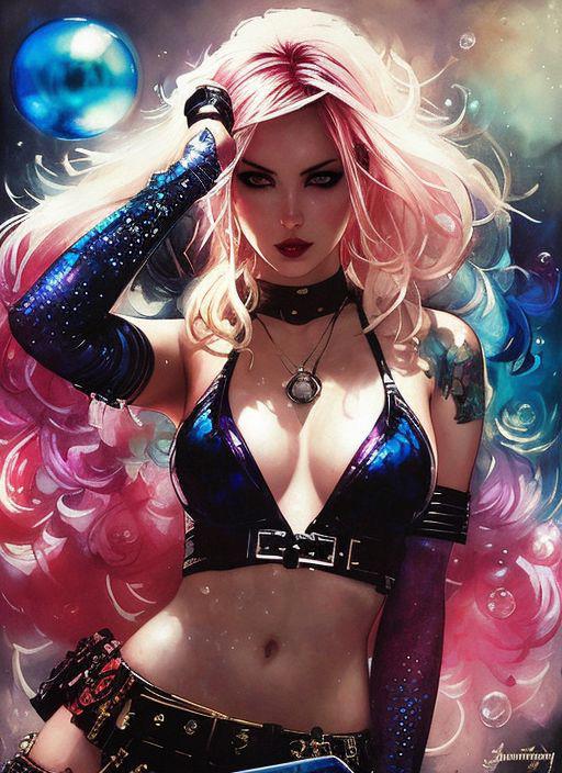 style of joemadureira drunken beautiful woman as delirium from sandman, (hallucinating colorful soap bubbles), by jeremy mann, by sandra chevrier, by dave mckean and richard avedon and maciej kuciara, punk rock, tank girl, high detailed, 8k