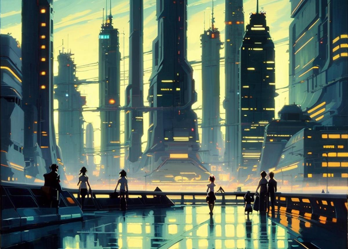 "star farm city", a far future sci-fi decopunk painting by greg manchess and makoto shinkai, trending on artstation, [:vibrant digital painting:0.4]