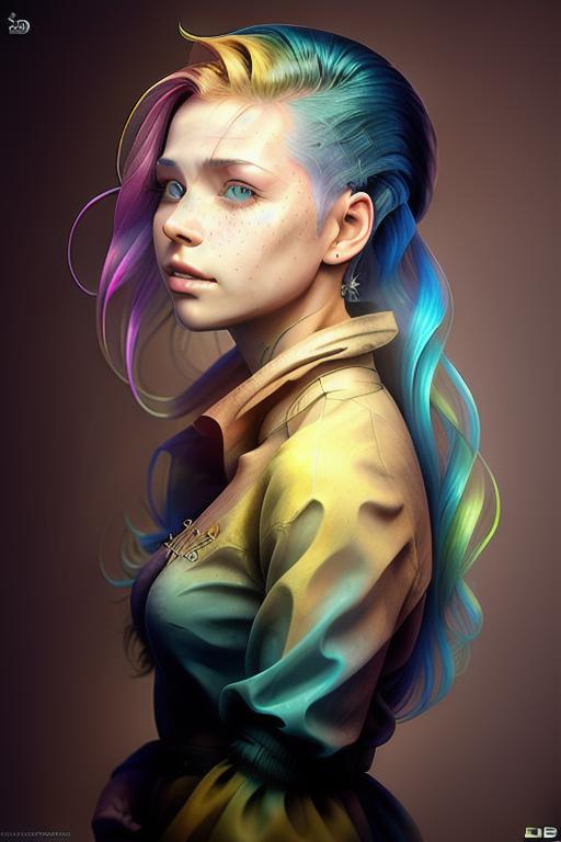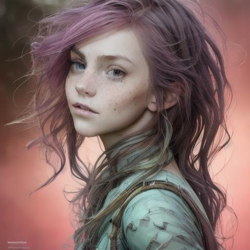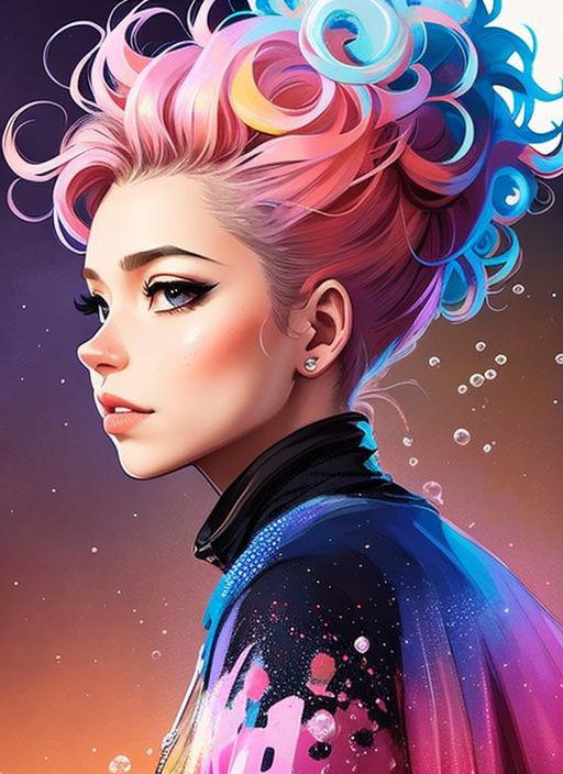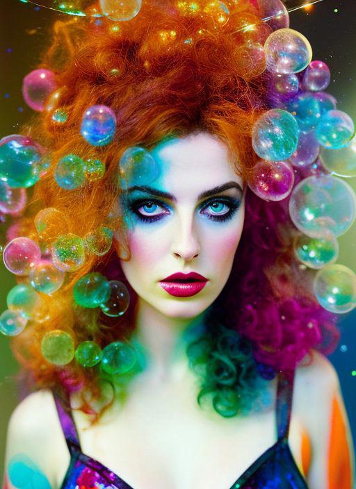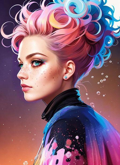 freckles, drunken beautiful woman as delirium from sandman, (hallucinating colorful soap bubbles), by jeremy mann, by sandra chevrier, by dave mckean and richard avedon and maciej kuciara, punk rock, tank girl, high detailed, 8k