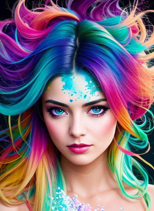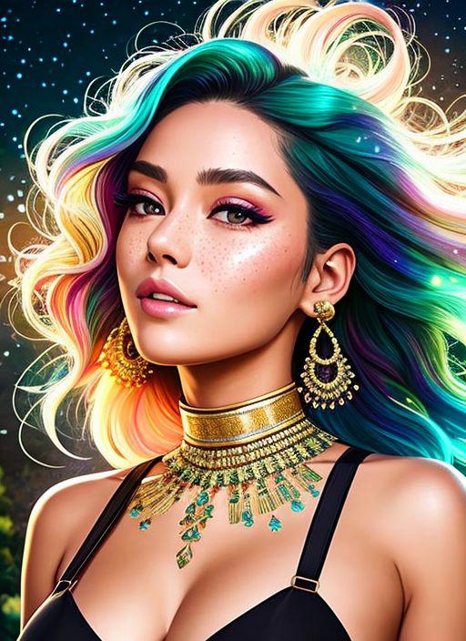 photorealistic painting ((full body)) portrait of ((stunningly attractive)) a woman at a music festival, ((perfect feminine face)), (+long colorful wavy hair), (+glitter freckles), glitter, wearing a dress, intricate, 8k, highly detailed, volumetric lighting, digital painting, intense, sharp focus, art by artgerm and rutkowski and alphonse mucha, cgsociety, samdoesartv2, award winning half body portrait of a woman in a croptop and cargo pants with ombre navy blue teal hairstyle with head in motion and hair flying, paint splashes, splatter, outrun, vaporware, shaded flat illustration, digital art, trending on artstation, highly detailed, fine detail, intricate
