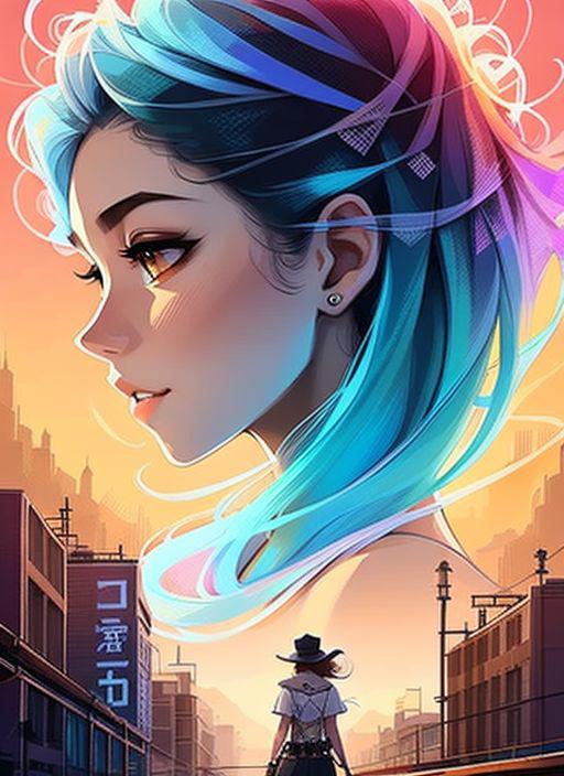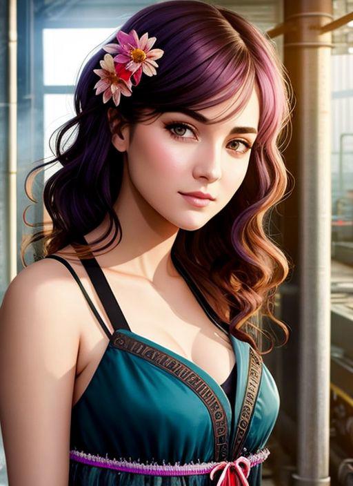 Charlie Bowater realistic Lithography sketch portrait of a woman, flowers, [gears], pipes, dieselpunk, multi-colored ribbons, old paper texture, highly detailed, (samdoesartv2:0.5), award winning half body portrait of a woman in a croptop and cargo pants with ombre navy blue teal hairstyle with head in motion and hair flying, paint splashes, splatter, outrun, vaporware, shaded flat illustration, digital art, trending on artstation, highly detailed, fine detail, intricate