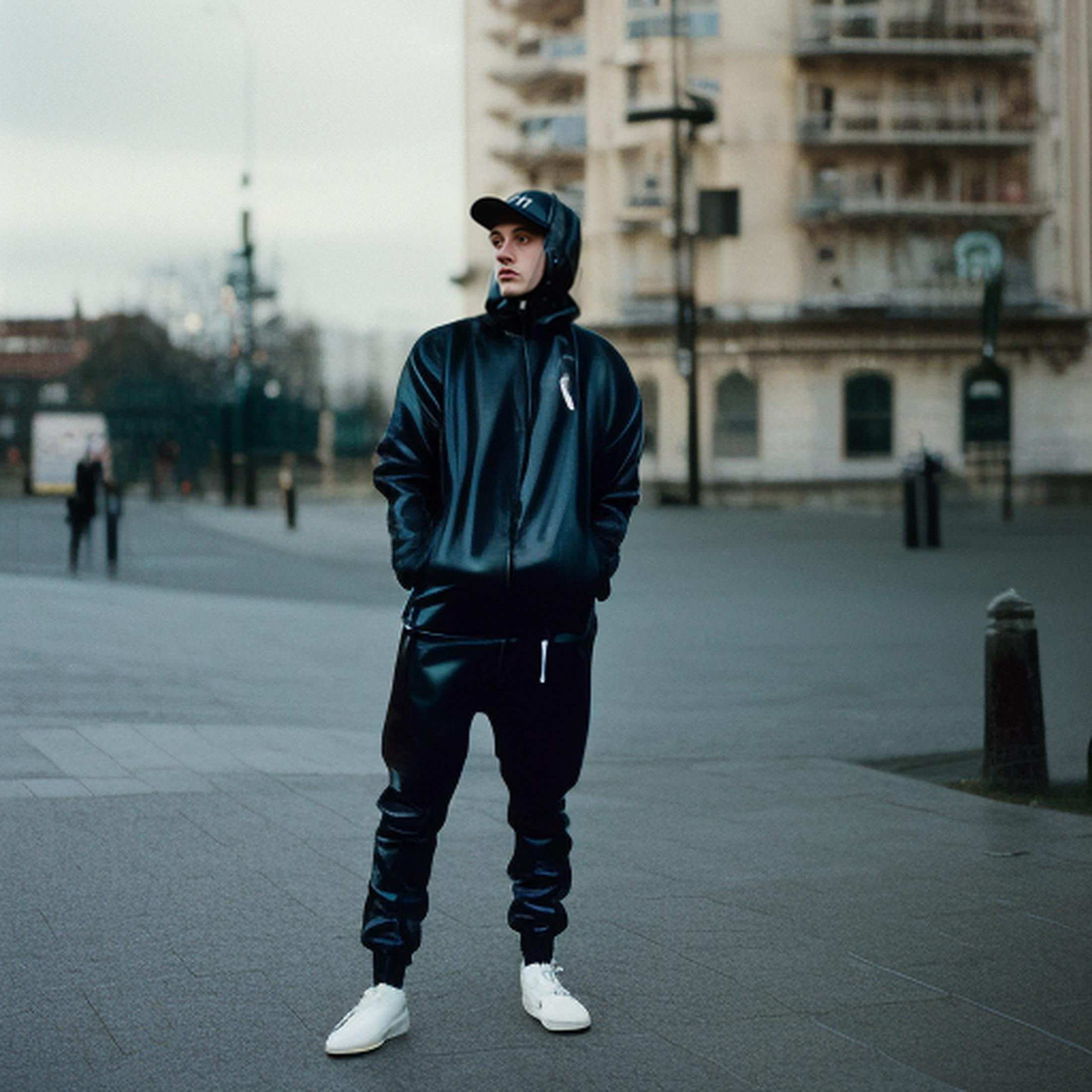 analogue style 2 ((skinny)) male twunks hugging, nsfw, portrait, detailed face, (black shiny latex tracksuit), black baseball cap, white trainers, blue eyes, chav, scally, poor, urban street background, night, dark, 35mm color movie still, photorealistic,