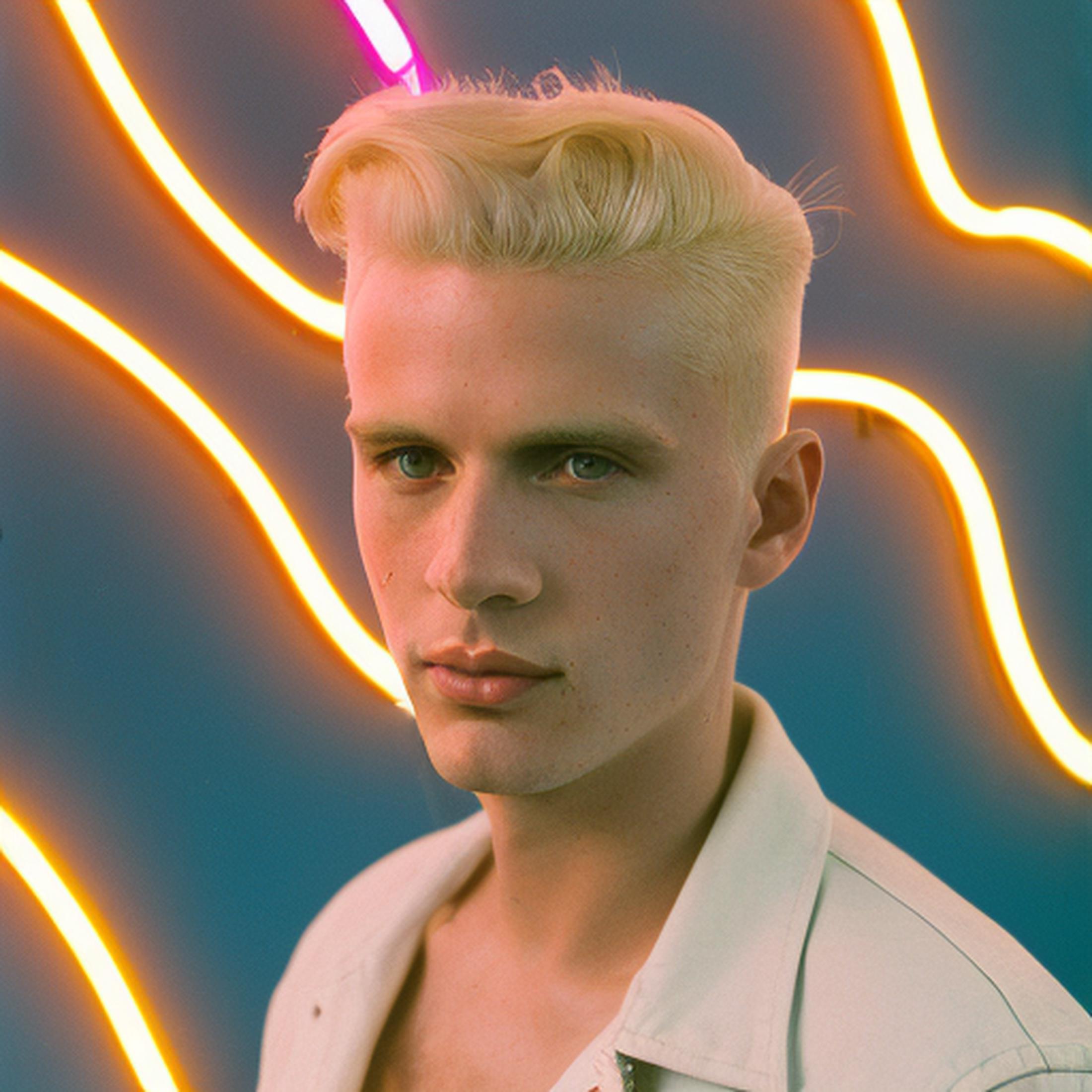 analogue style ((skinny)) male twunk holding microphone, nsfw, full body, focus on camera, detailed face, New wave, New romantic, 80's, bare chest, very short blonde hair with shaved sides, blonde stubble, (blonde chest hair), ((eyeliner)), lipstick, blue eyes, stage background, neon lights, 35mm color movie still, photorealistic,