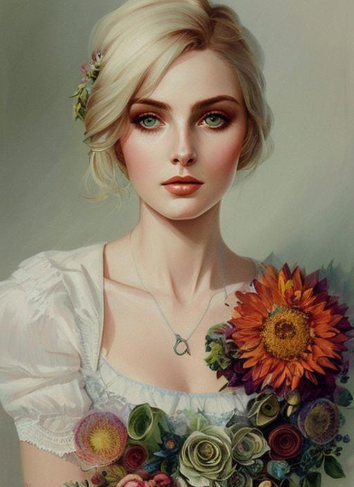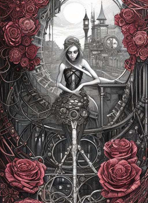 Charlie Bowater realistic Lithography sketch portrait of a woman, flowers, [gears], pipes, dieselpunk, multi-colored ribbons, old paper texture, highly detailed
