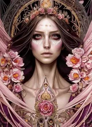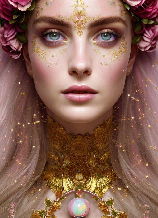 (symmetry:1.1) (floral:1.05) woman as a beautiful goddess, pink and gold and opal color scheme, beautiful intricate filegrid facepaint, intricate, elegant, highly detailed, digital painting, artstation, concept art, smooth, sharp focus,
