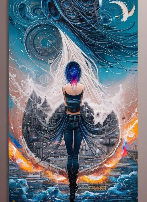 sks place award winning half body portrait of a woman in a croptop and cargo pants with ombre navy blue teal hairstyle with head in motion and hair flying, paint splashes, splatter, outrun, vaporware, shaded flat illustration, digital art, trending on artstation, highly detailed, fine detail, intricate