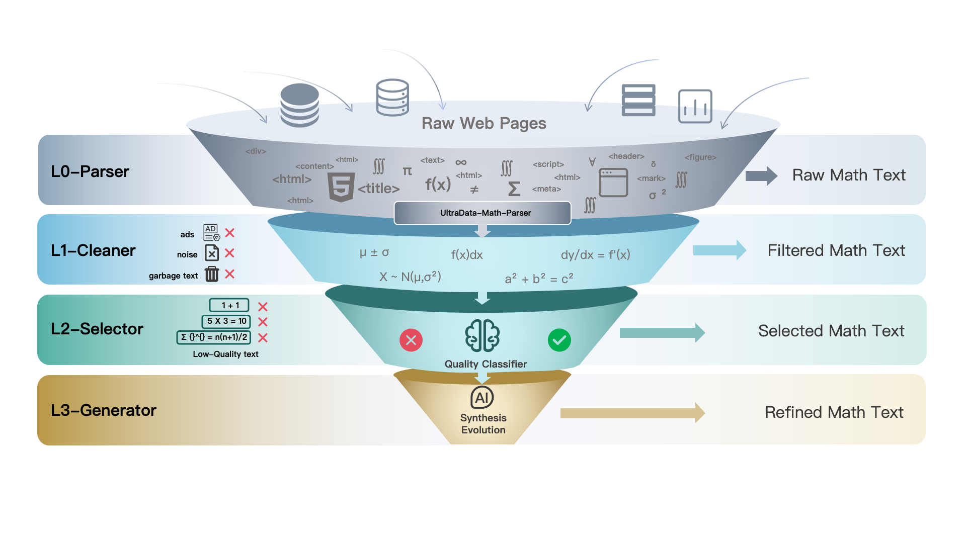 To address these issues, we propose UltraData-Mathโa large-scale high-quality pre-training dataset for mathematical reasoning tasks. This dataset is developed based on the UltraData L0-L4 Tiered Data Management Framework, containing four progressive levels: