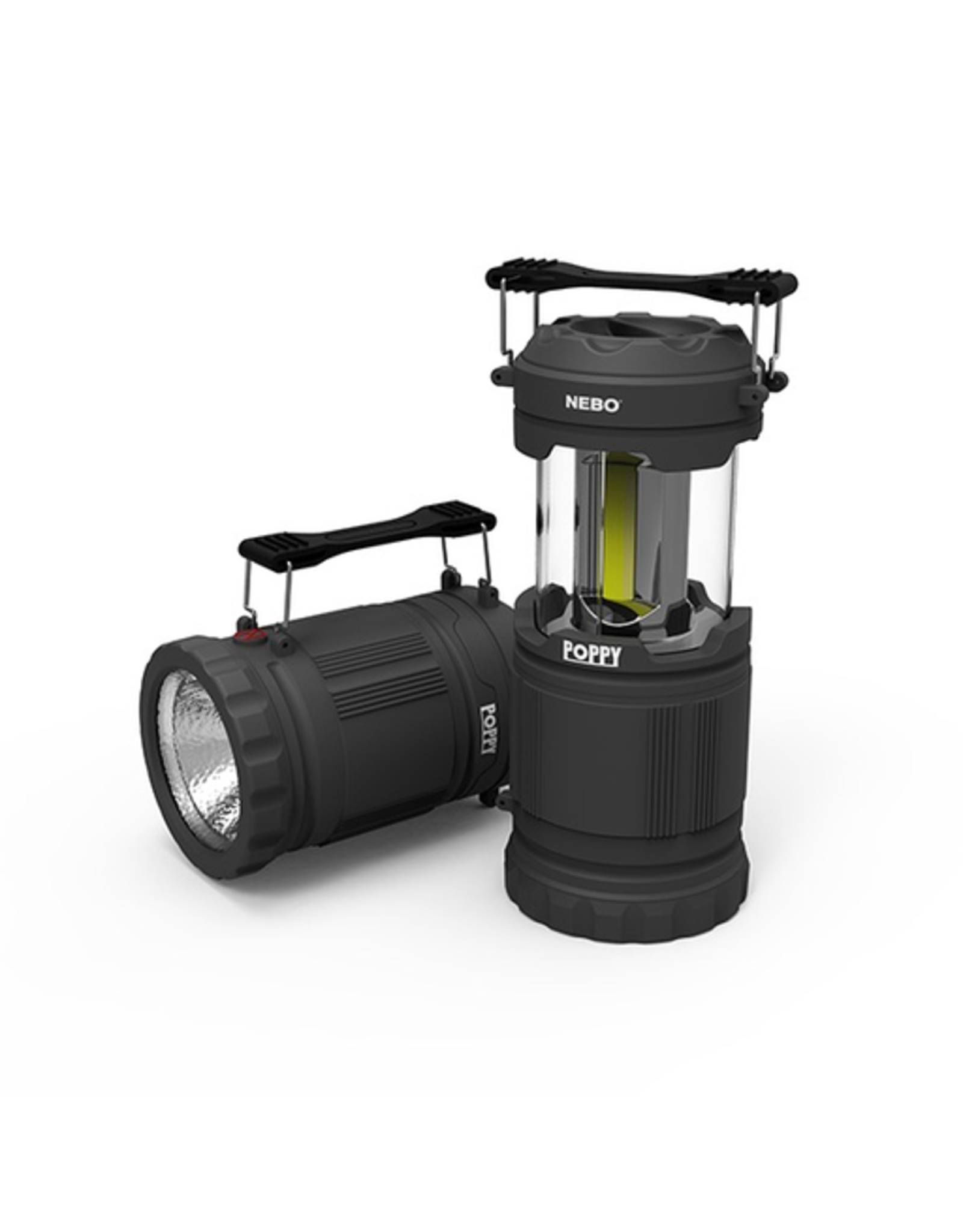 A imagem mostra uma lanterna de LED preta com corpo cilíndrico e topo redondo. A lanterna é posicionada sobre uma superfície branca e parece estar em uma pose vertical com a lente apontando para cima. A lanterna tem uma alça de transporte preta que se estende do topo e é fixada por dois parafusos. Na lateral da lanterna, há um texto que diz “Nebolite” em letras maiúsculas brancas. Abaixo do texto, há um logotipo que diz “Poppy” em letras maiúsculas brancas menores. A lanterna tem uma luz LED visível no topo, que emite uma luz amarela. A imagem é uma fotografia de produto com fundo branco liso, projetada para mostrar o design e as características da lanterna.