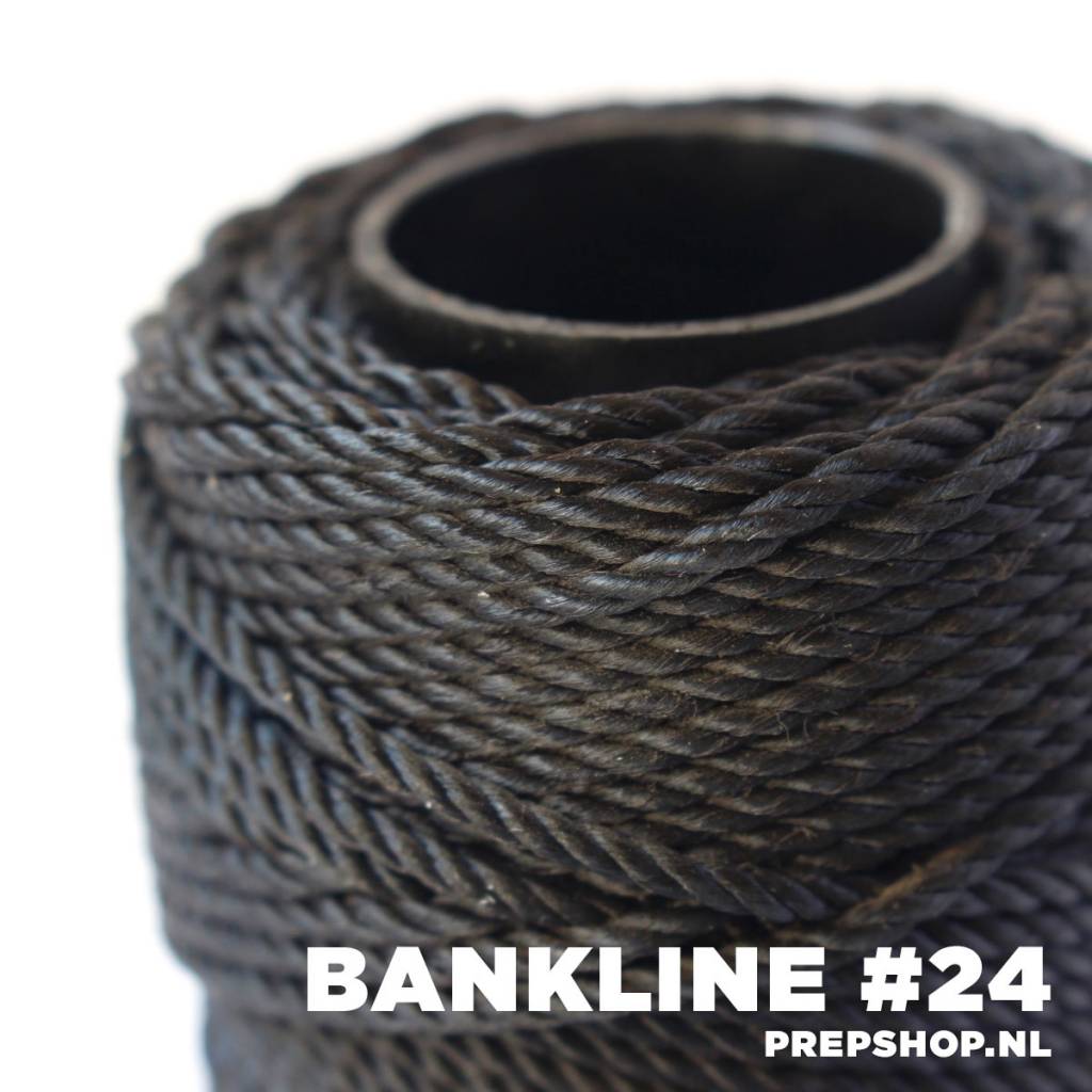 A imagem mostra uma linha de corda enrolada em forma de rolo. A linha é de cor escura e parece ser feita de um material grosso e texturizado, comumente usado para diversas finalidades, como amarração ou corda. A corda é enrolada em uma bobina e a parte enrolada é visível, com as fios cruzando uns sobre os outros para criar uma aparência de corda. No canto inferior direito da imagem, há um texto em branco que diz “BANKLINE #24” seguido por “PREPSHOP.NL”, indicando que a imagem pode estar relacionada a uma marca ou produto. O fundo da imagem é branco, o que contrasta com a cor escura da linha, destacando-a. A imagem é uma fotografia em close-up, focando na linha e não no seu ambiente.