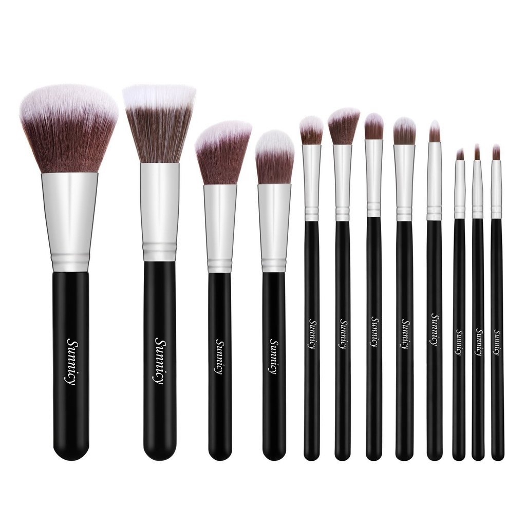 A imagem mostra uma coleção de pincéis de maquiagem contra um fundo branco. Os pincéis são organizados em duas fileiras, com os pincéis maiores na linha superior e os menores na linha inferior. Cada pincel tem um cabo preto e uma ponta de pincel branca ou marrom claro. Os pincéis maiores têm uma ponta de pincel mais larga e são usados para aplicar base ou sombra, enquanto os menores têm uma ponta de pincel mais fina e são usados para aplicar delineador ou sombra. Cada pincel possui uma etiqueta com o nome da marca “Summy” e o nome do produto, como “Pincel de Maquiagem Base” ou “Pincel de Maquiagem Sombra”. A imagem é uma fotografia de produto com foco nos pincéis e seus detalhes, destinada a mostrar a variedade de pincéis disponíveis para maquiagem.