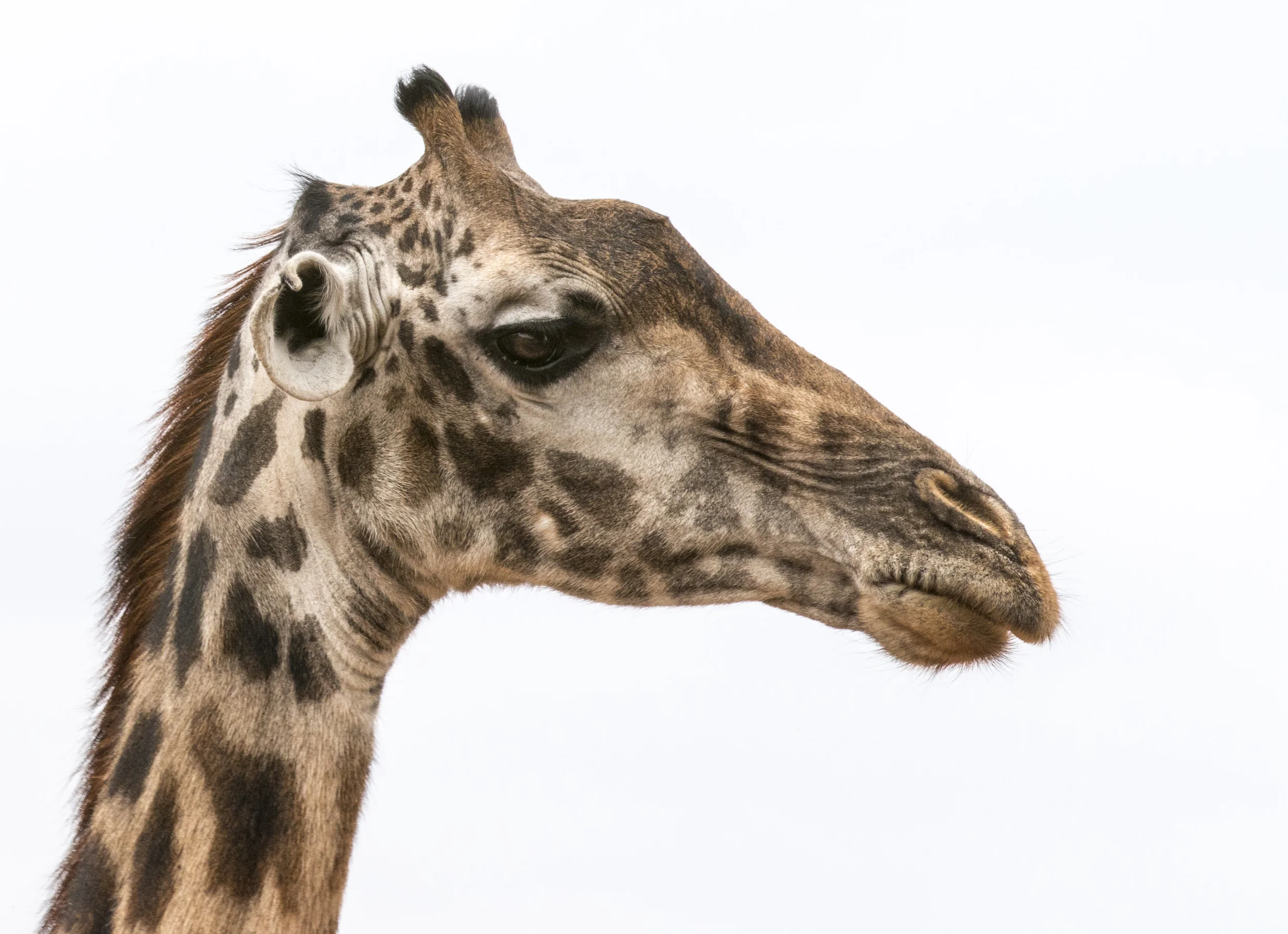 A imagem é uma fotografia em close de um girasso, um animal grande e peludo com manchas pretas e brancas. O girasso está voltado para a esquerda e a cabeça está inclinada para baixo, com o foco na boca e no pescoço. A boca está aberta, revelando os dentes e a língua, e o pescoço é ligeiramente estendido. O fundo é branco e desfocado, o que acentua o girasso como tema principal da imagem. Não há textos ou outros objetos discerníveis na imagem.