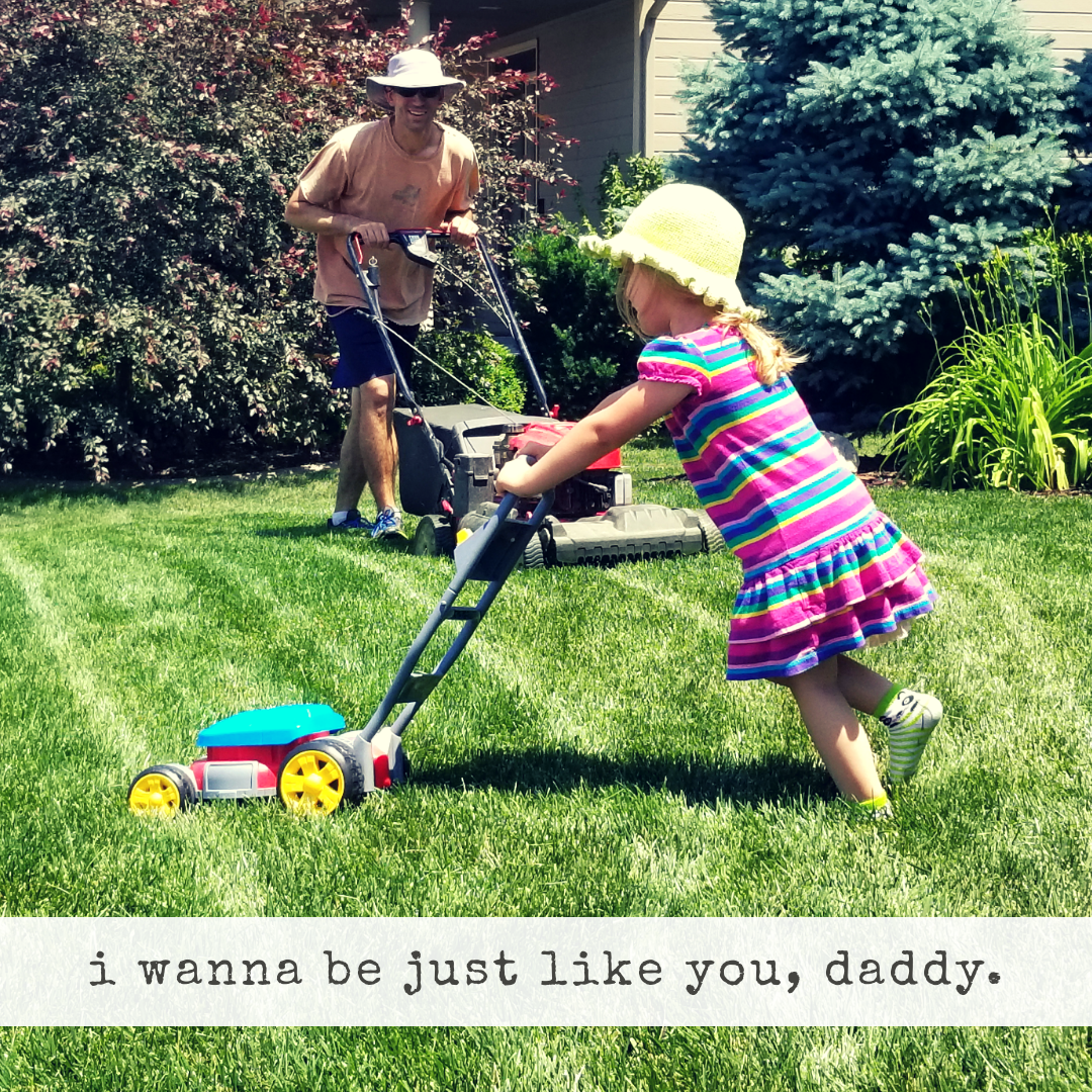 A imagem é uma fotografia colorida que mostra uma criança e um adulto envolvidos em uma atividade ao ar livre. A criança, que parece ser uma menina, está vestindo uma roupa colorida com um vestido listrado e um par de meias listradas. Ela está usando um chapéu de palha amarelo e está agachada, com a mão direita tocando o chão e a mão esquerda apoiada no que parece ser um pequeno carrinho de brinquedo azul com rodas amarelas. O carrinho de brinquedo está em uma superfície gramada. O adulto, que parece ser um homem, está vestindo uma camisa de manga curta de cor clara e um chapéu de palha. Ele está segurando uma ferramenta de corte de grama, que está conectada a um motor, e parece estar cortando a grama. O fundo mostra uma área gramada bem cuidada com arbustos e árvores ao fundo. No canto inferior direito da imagem, há uma sobreposição de texto em fonte casual que diz: “