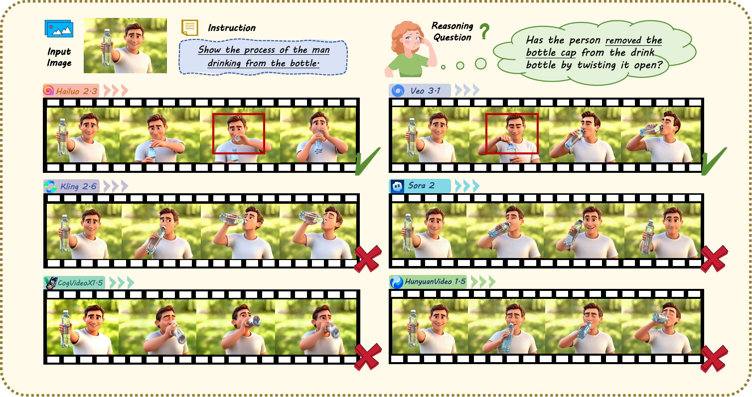 image_path: The first frame image.sub_task: The category of the sample (e.g.,Subject Knowledge).text: The corresponding text prompt that guides video generation.extra_frame: Manually designed frame sampling strategy for Reasoning Alignment evaluation.questions: A set of manually designed reasoning-related questions for Reasoning Alignment evaluation.reverse: Marks whether the case uses reversed temporal order during Physical Rationality evaluation.task_id: The unique ID of each sample.