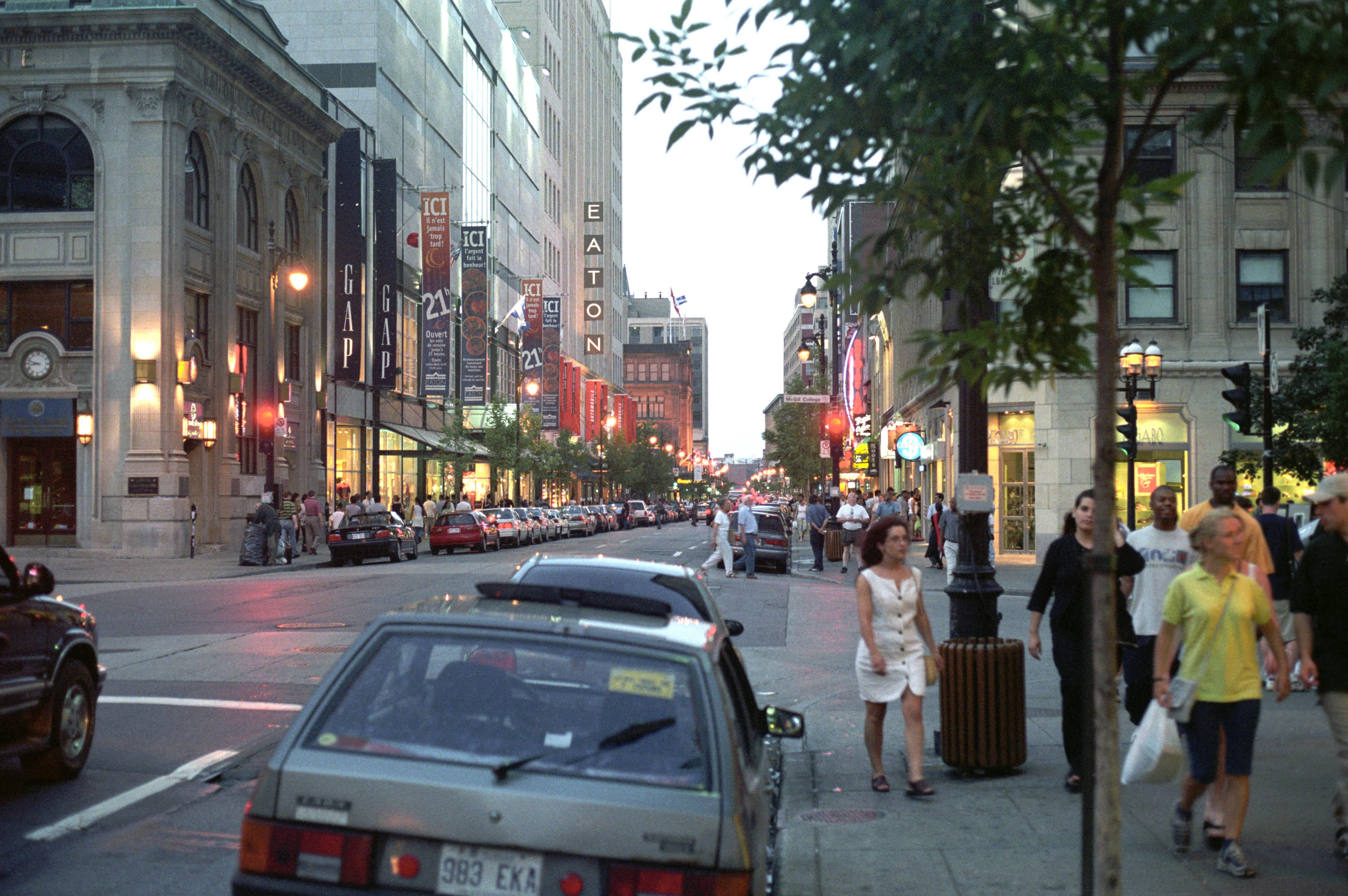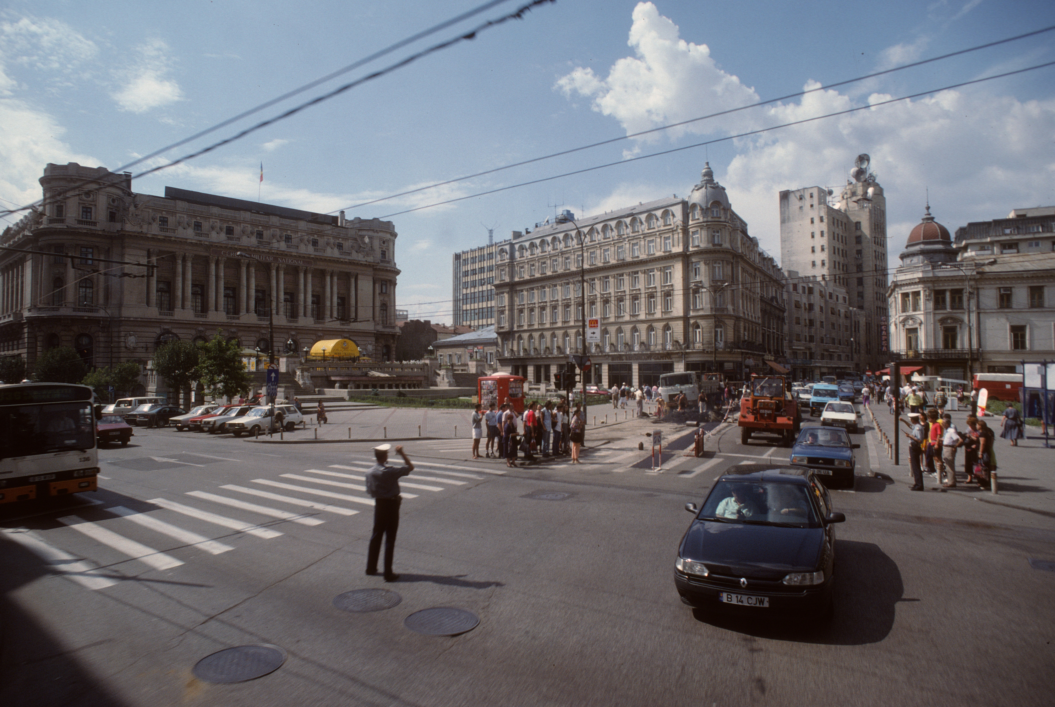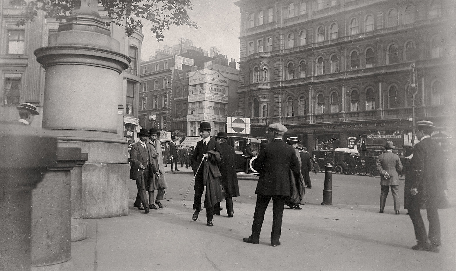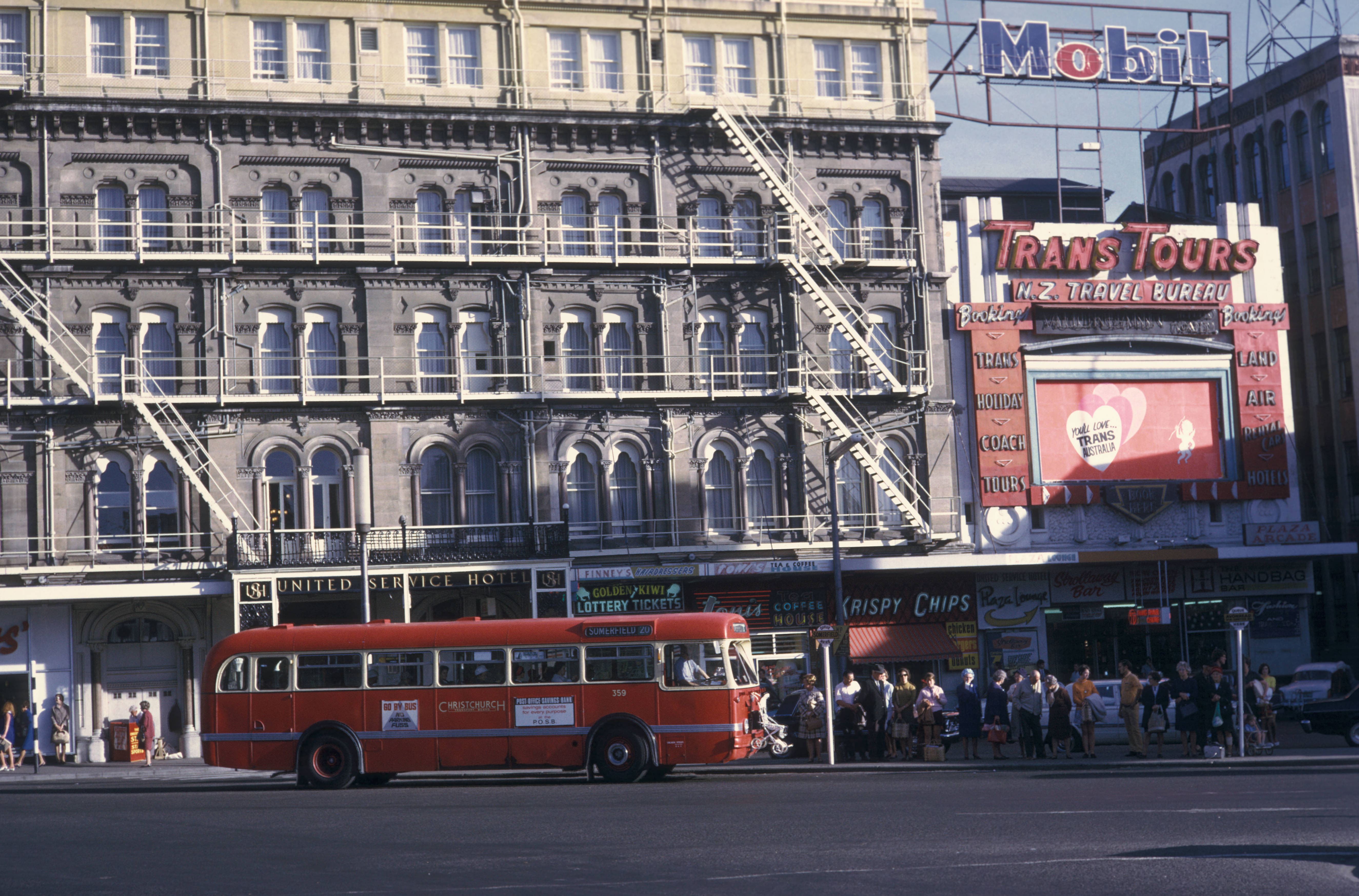 A street scene in Christchurch, New Zealand, in front of the United Service Hotel which was later demolished in 1990.