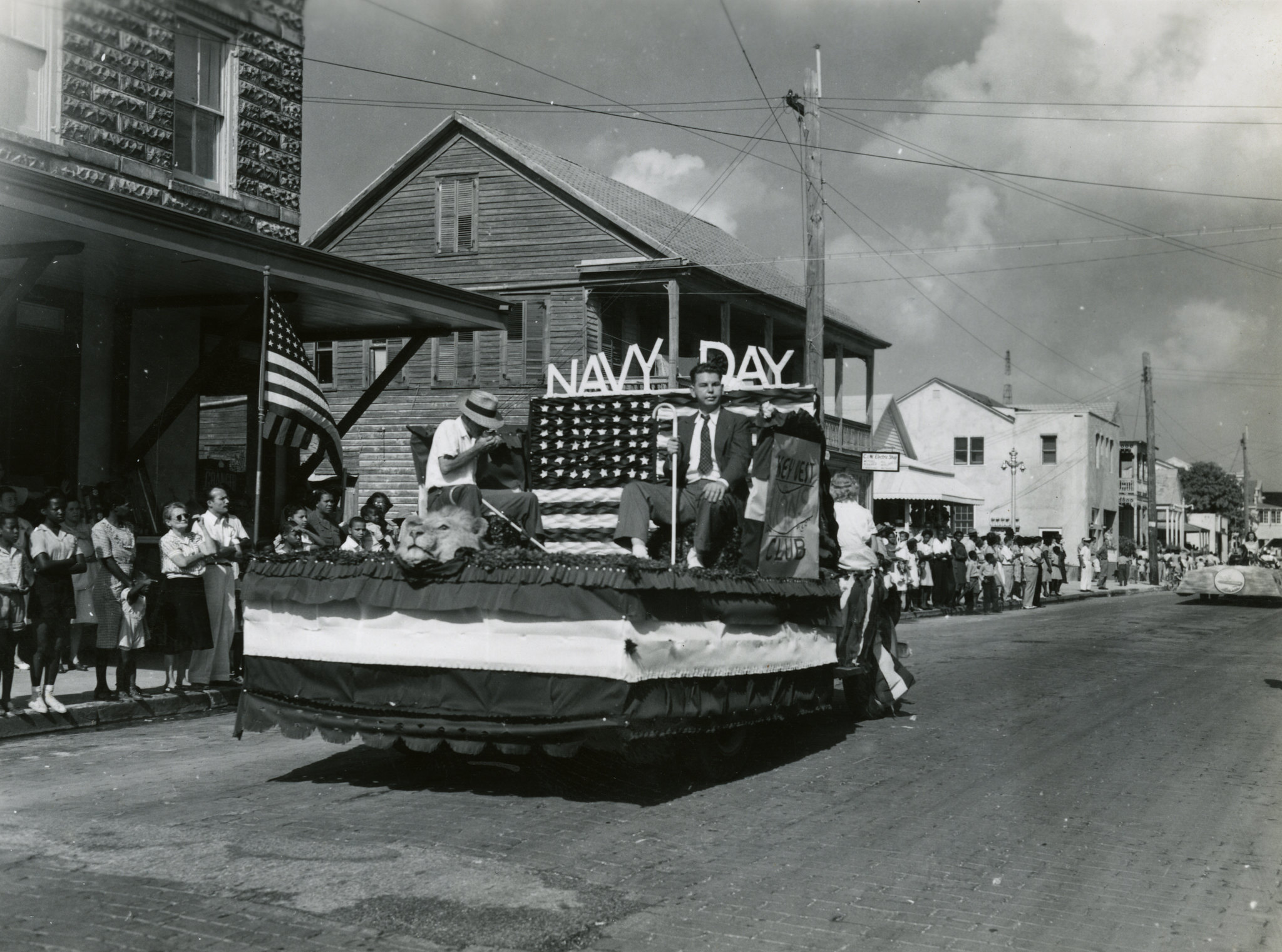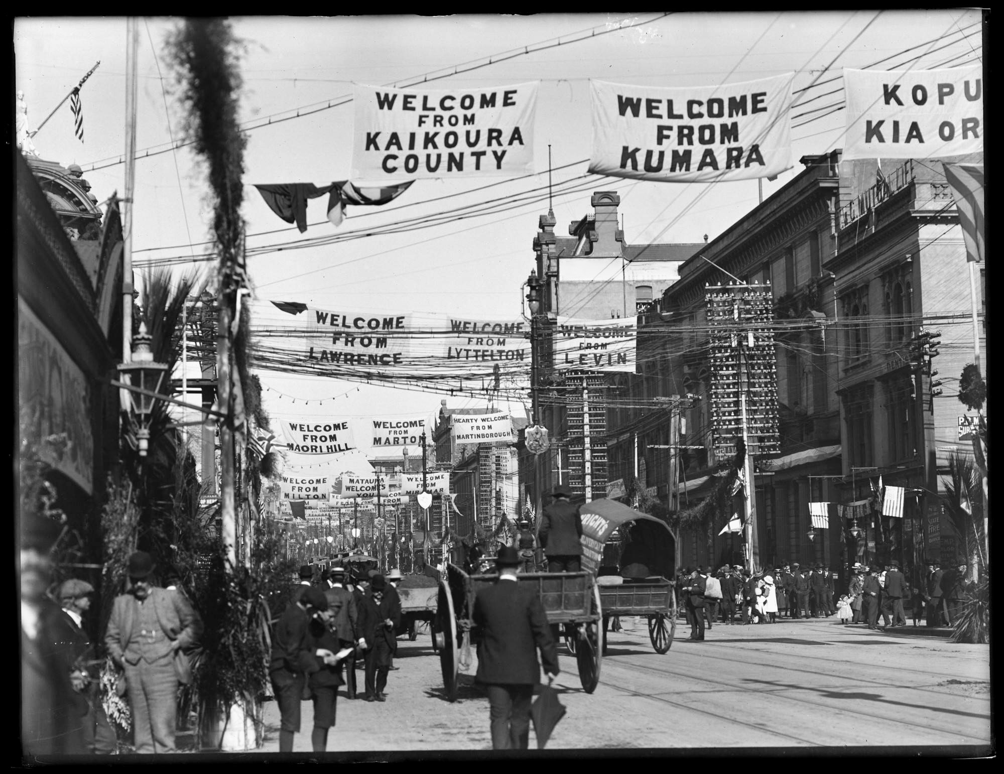 Decorations hanging in Auckland in preparation for a visit from the US Navy Great White Fleet.