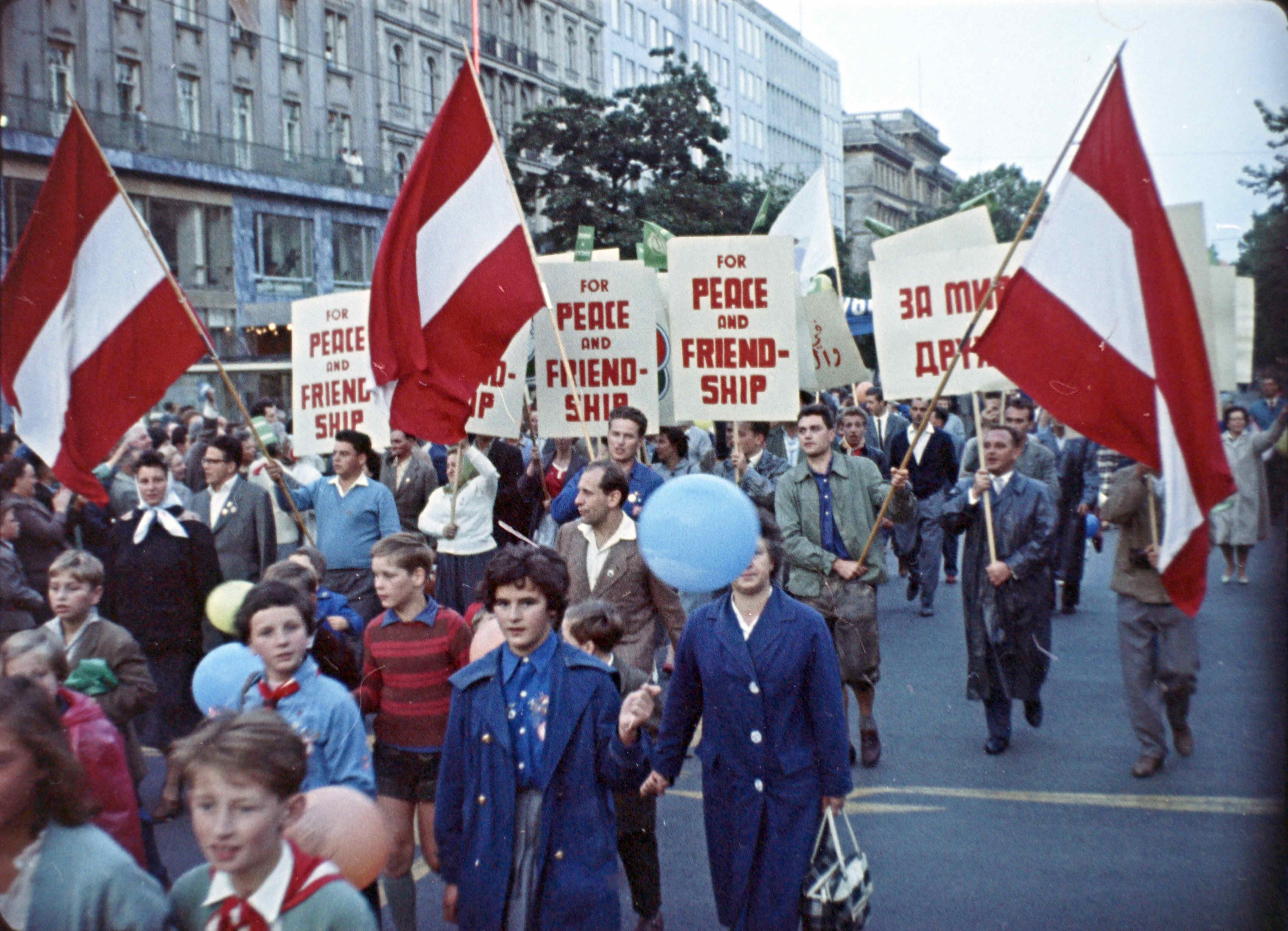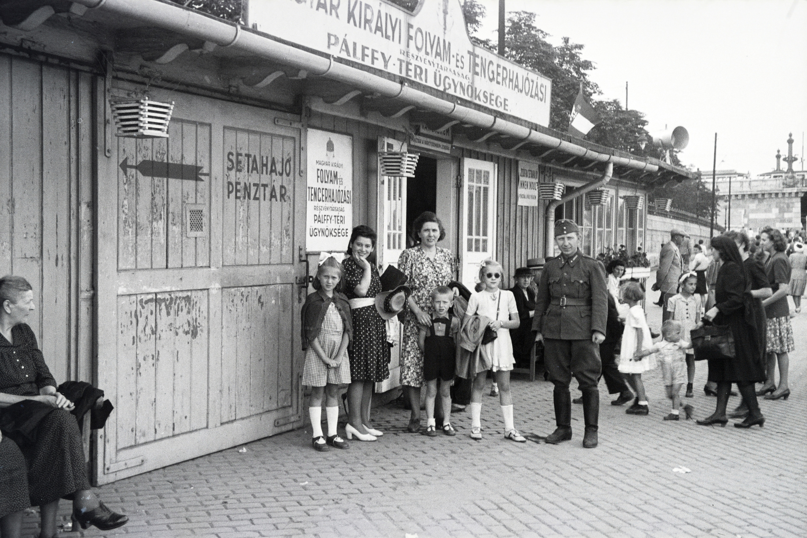 Crowds posing for a photo with an officer in Budapest, during the early 40s.