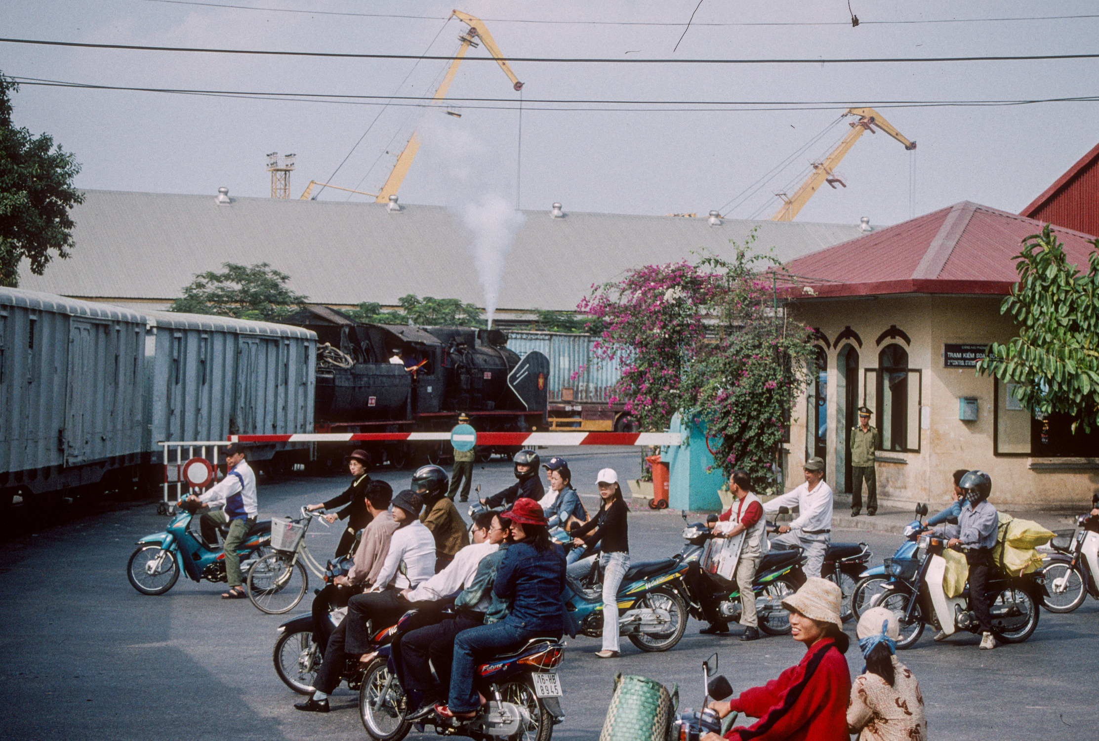 People on bikes waiting for a train to pass at a crossing in Hai Phong, Vietnam, during the early 2000s.