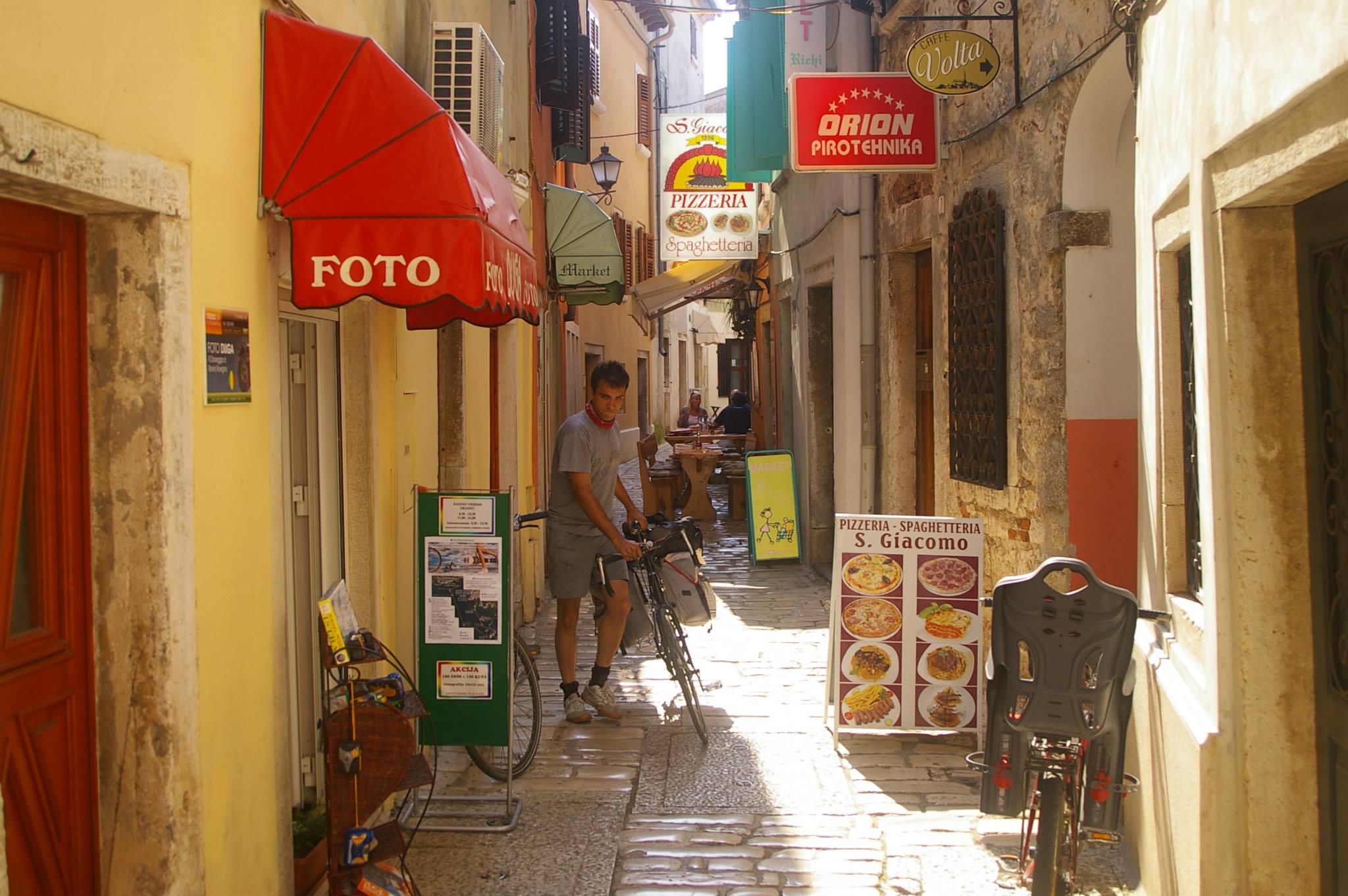 A man pushing a bike through the streets of Rovinj, Croatia.