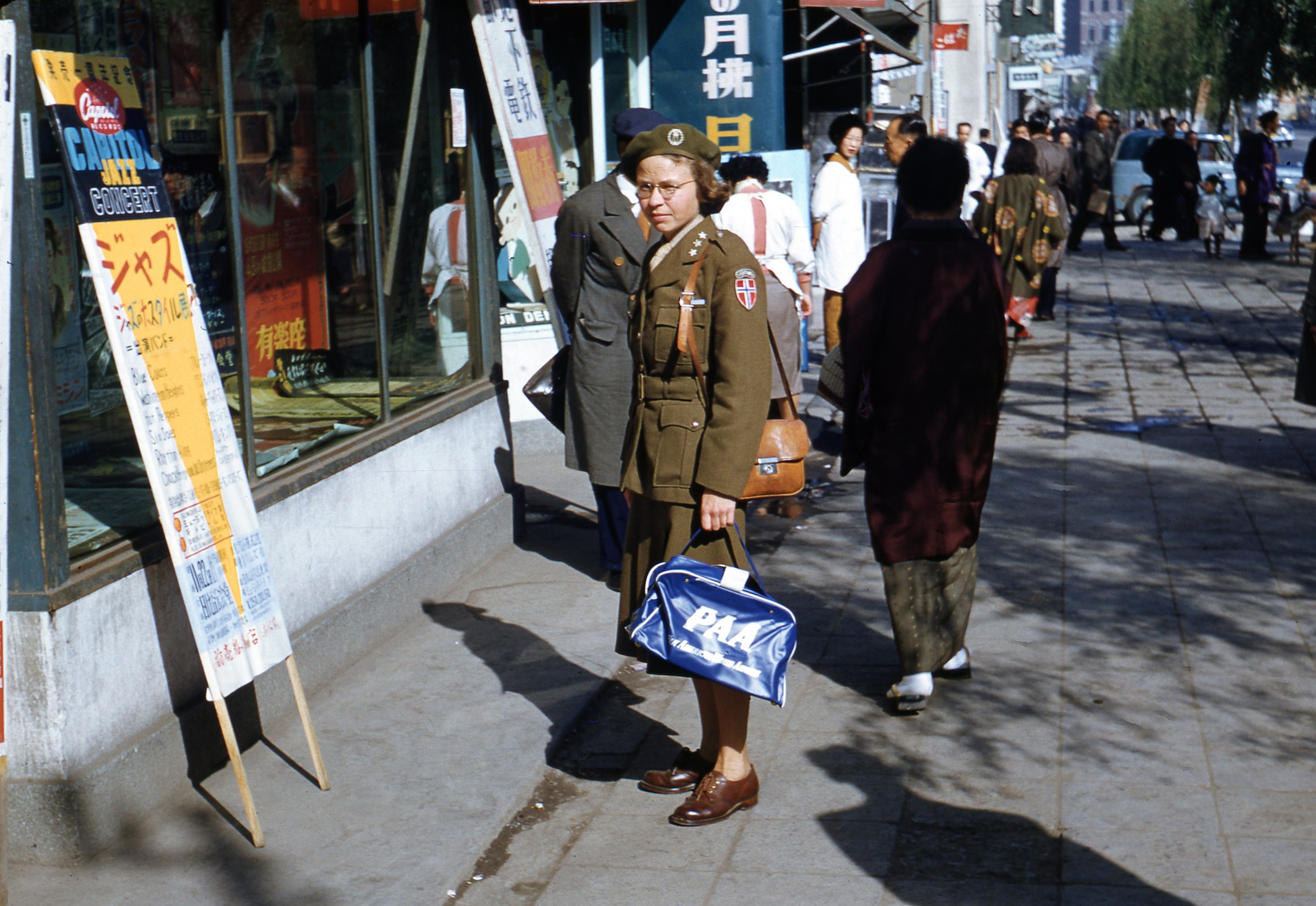 A Norwegian field surgeon on the streets of Tokyo during a brief transit en route to the Korean War front.