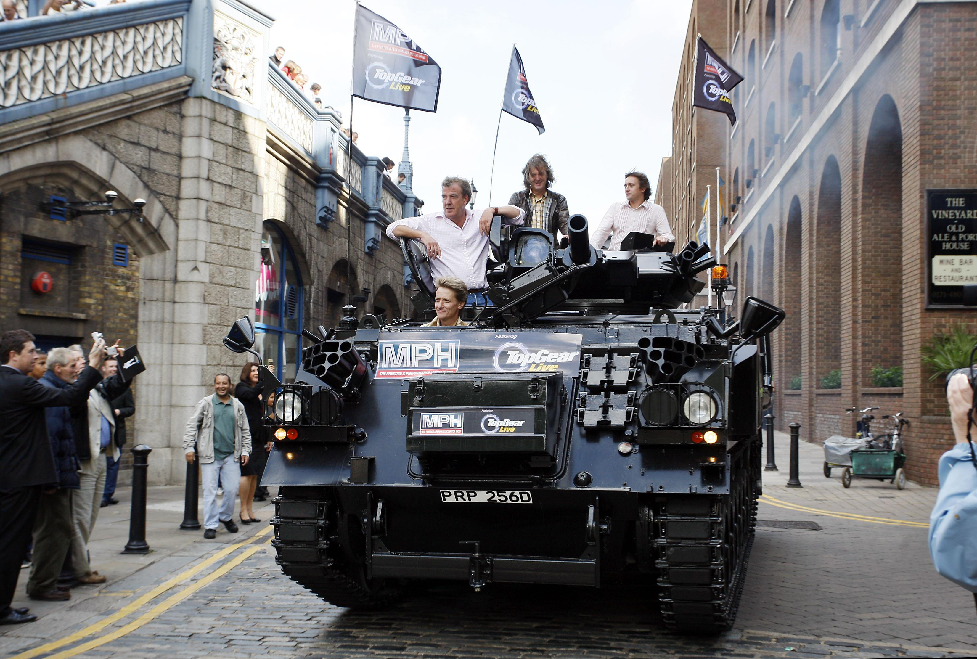 Top Gear presenters Clarkson, Hammond and May driving a FV434 repair vehicle to a Press Conference near Tower Bridge.