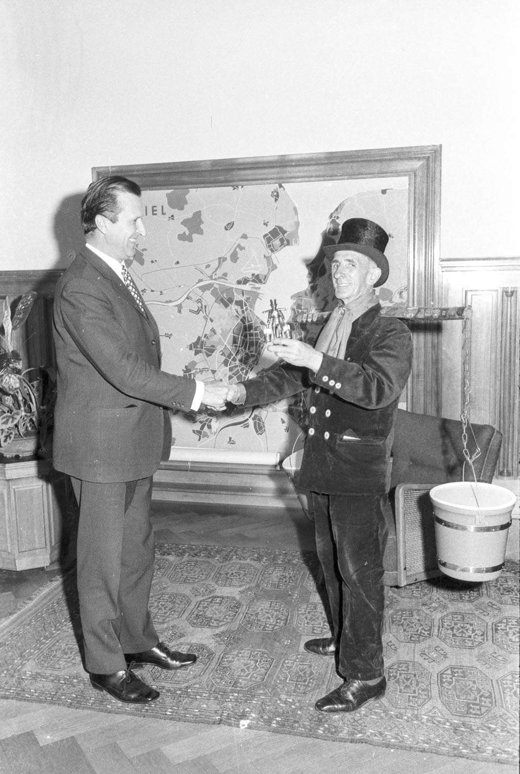 A man from Kiel carrying a shoulder yoke receiving the 'Hummel-Hummel' award, named after an iconic water carrier from 19th century Hamburg.