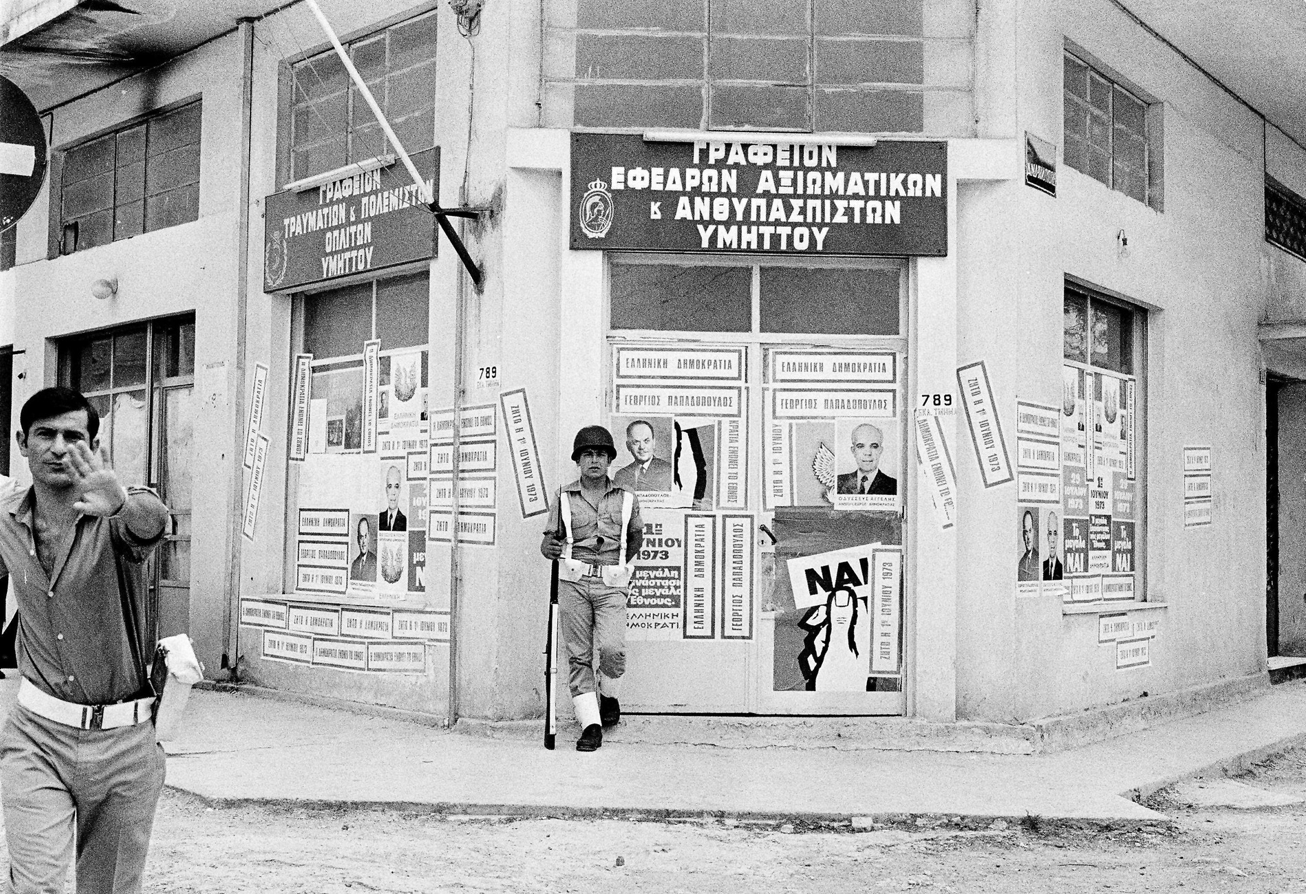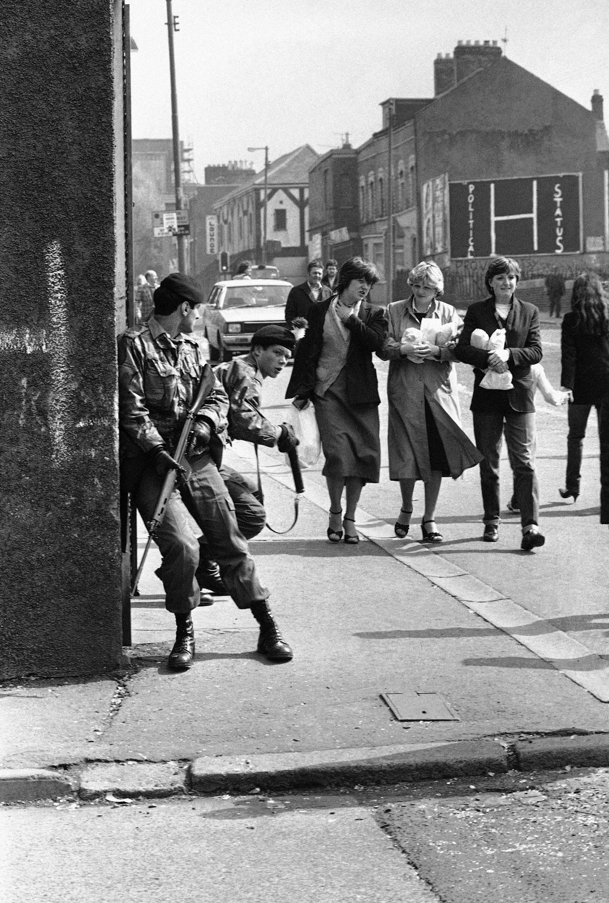 Three girls strolling past two British soldiers keeping watch for snipers after a spate of rioting in Belfast, Northern Ireland.