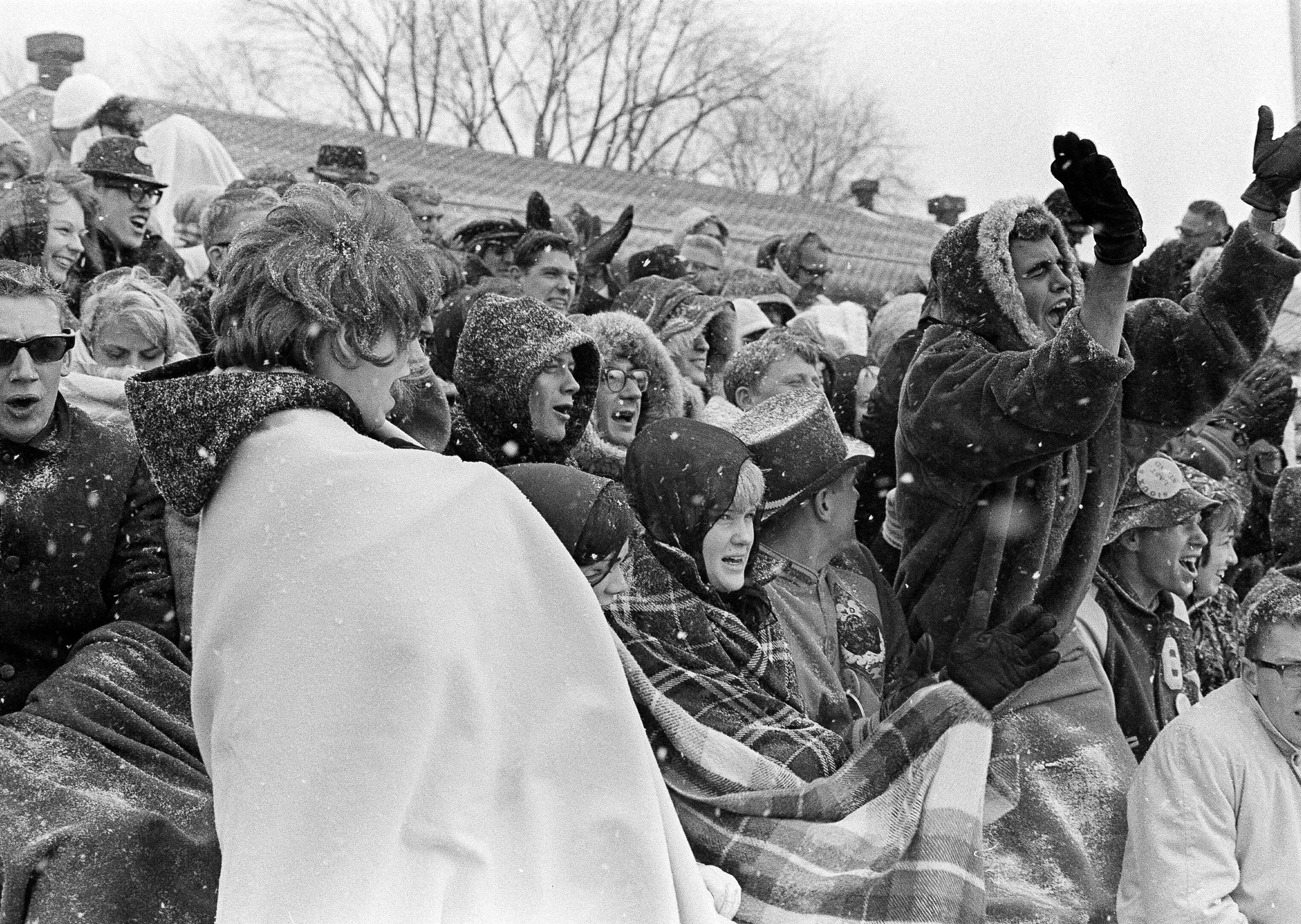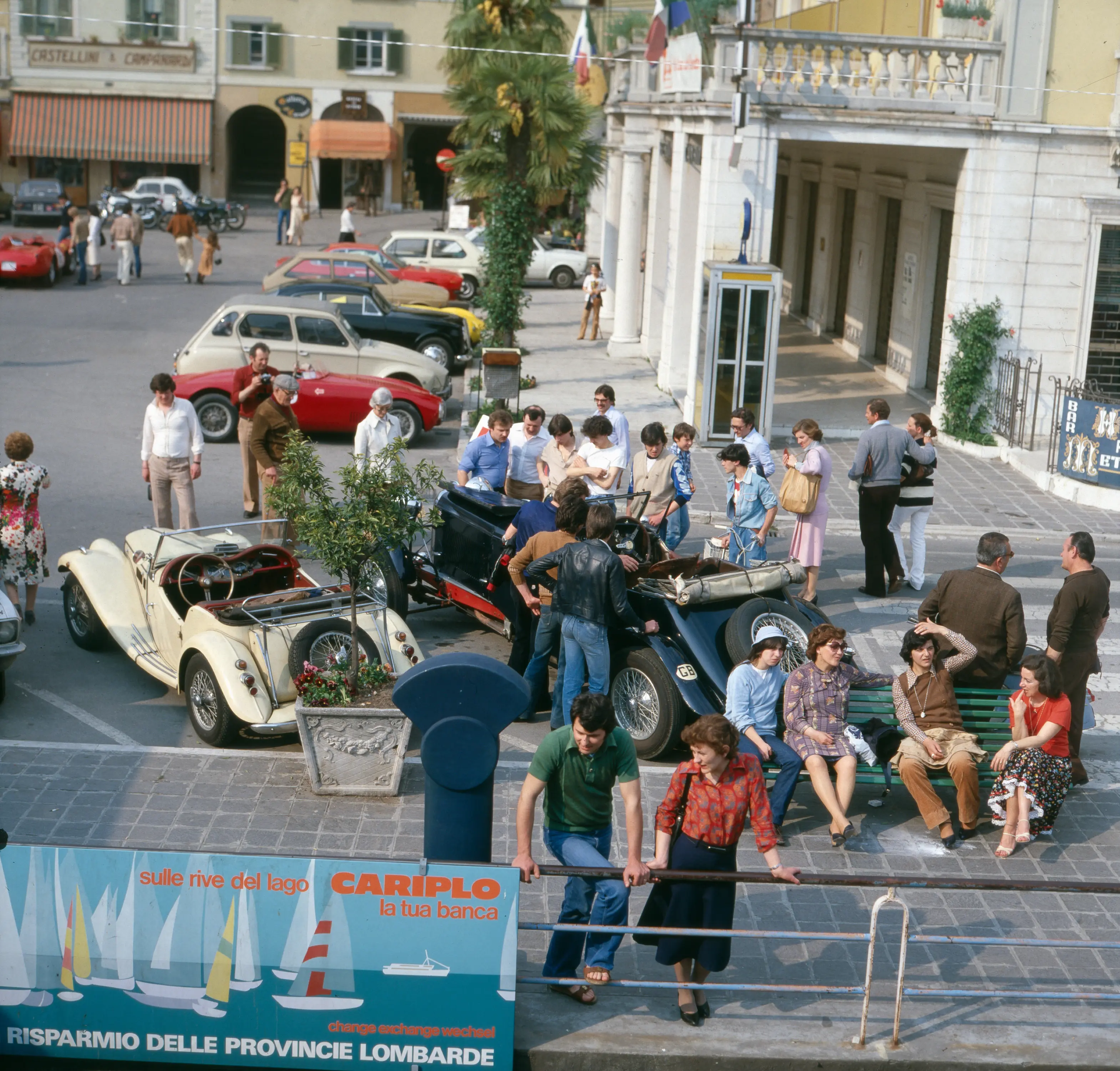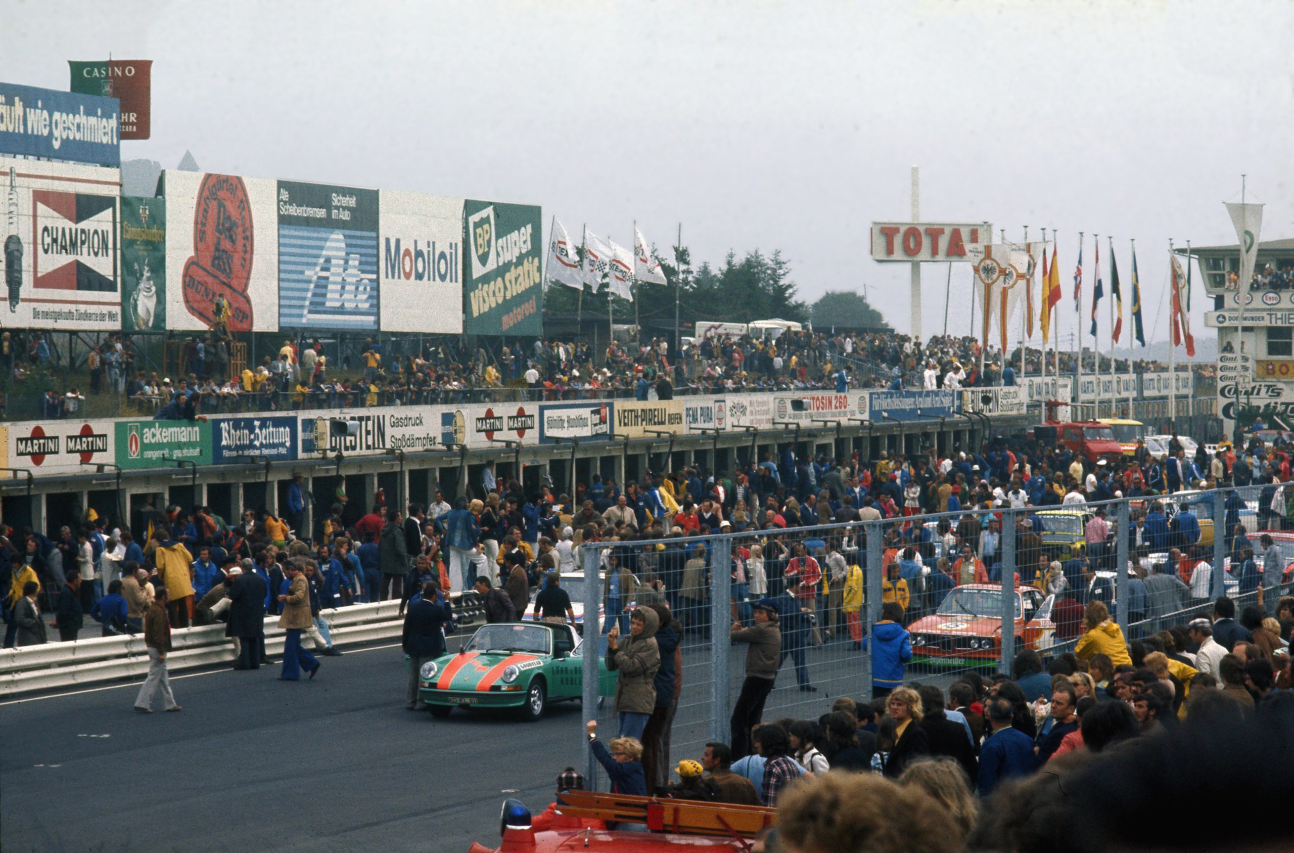 Crowds flooding the track at the start of the 1973 6 Hours of Nürburgring, an endurance race held annualy in West Germany.