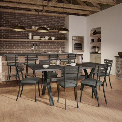 A rustic kitchen features a Darcelle 7-piece dining set with a medium dark gray wood top and semi-transparent gunmetal base, surrounded by soft brown fabric chairs, under industrial pendant lights, with exposed brick walls and wooden beams, creating a warm, cozy blend of modern and vintage styles.